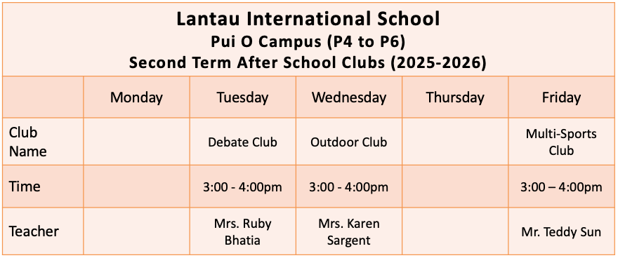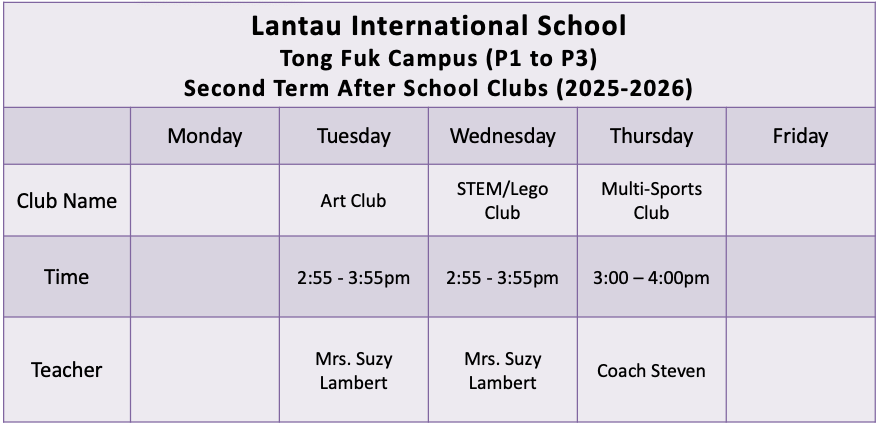 L.I.S. offers a variety of optional after-school clubs during the school term. Clubs may vary from one year to the next and are announced in the first weeks of each trimester. For the 2025-26 academic year, the fee is HK$1,800 for 10 sessions.